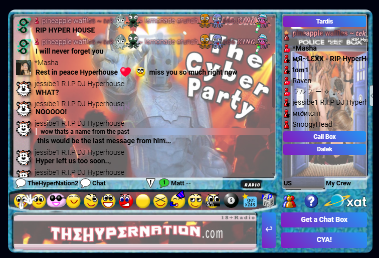 HyperHouse was always the life of the party, literally. He’s been around during Xats’ peak and the lowest times on Xat. While always having everypower since it first existed, Hyper would have his own chat TheHyperNation. This chat was very popular during Xats’ peak. DJs from across the world would access his chat & website. He had a special livestream feature that let DJs schedule a slot to livestream directly on his chat & website. It was so cool, these DJs (Hyper included) would DJ clubs around the world with different camera angles and give us a special experience on his chat. Hyper was always a fun guy to talk to, and he was someone I could talk to on my worst days. Hypers radio station was used for official chats such as Chat, Trade, Help & more. He would always go live for parties, events, or even new power releases in Trade. The world & Xat community lost a special friend, with memories we will never forget.