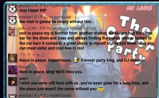 Our community suffered a great loss today with the passing of DJ HyperHouse, who touched many lives here with his presence in the Xat community.